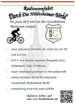 - Verändertes Team, neue Ideen ! - Neuer Kontrollhotspot in Henneckenroden mit Topverpflegung - Geänderte schöne Strecken für 2018 von 45, 85 und 115 km durch die malerische Landschaft Hildesheimer Börde - Anmeldung auch mit Scan & Bike - Weitere Infos unter www.rsc-hildesheim.de