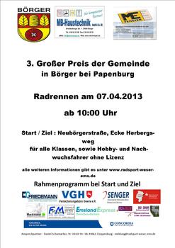 Am 07.04.2013 findet nun schon zum 3. Mal das Radrennen in Börger statt. Auf der 13,6 km langen Runde werden alle Klassen angeboten. Auch für die Hobbyklassen wird es ein Rennen über 54 km geben. Bis jetzt haben sich knapp 500 Teilnehmer angemeldet. Es werden aber noch Meldungen angenommen, ohne Nachmeldegebhren. Einfach eine Mail schicken an meldung@radsport-weser-ems.de mit Angabe von Klasse, Namen, Verein und Geburtsdatum.
