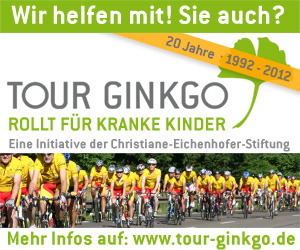 Unter dem Motto "Fahr' mit - bleib' fit" wird die TOUR GINKGO 2013 am 7. Oktober um 10:00 Uhr am Stadthaus in Ansbach gestartet. Die Schirmherrschaft dieser karitativen Tour durch den Landkreis Ansbach hat die Oberbürgermeisterin von Ansbach, Carda Seidel, übernommen. Die Fahrstrecke führt durch den landschaftlich herrlichen Landkreis Ansbach bis Rothenburg o.d.T. - Schillingsfürst - Dinkelsbühl - zurück nach Ansbach. An den verschiedenen Stationen (Städte und Gemeinden) werden Ginkgobäume gepflanzt, im Beisein der Bürgermeister und Bürger. Wir rufen alle Freunde (Aktive) des Radsports auf, diese karitative Radsportveranstaltung TOUR GINKGO 2013 durch aktive Teilnahme zu unterstützen. Der Vorstand des Klabautermann e.V. sowie das Organisationsteam Klabautermann ORGATEAM CHRISTOPH bedanken sich schon jetzt für Ihre aktive Teilnahme. Die Startunterlagen können beim ORGATEAM Christoph, Kreuthfeldstr. 18, D-91608 Geslau / Mittelfranken, Telefon 09867-978181 gerne zeitnah angefordert werden. Jeder aktive Teilnehmer an der TOUR GINKGO 2013 im Landkreis Ansbach nimmt an einer Tombola mit schönen Sachpreisen teil. Im Übrigen erhält jeder Teilnehmer eine schöne Teilnahmeurkunde. Der Vorstand des Klabautermann e.V. sowie das ORGATEAM Christoph freuen sich über eine zahlreiche Teilnahme an dieser karitativen Radtour. Bei Auswahl der Strecken wird der Klabautermann e.V. von der RSG Ansbach unterstützt.
